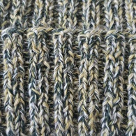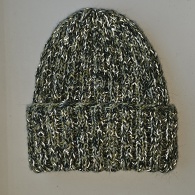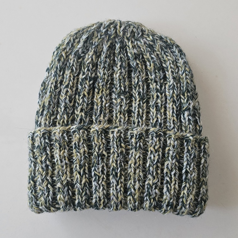 Pusvilnas cepure no dažādu zaļo toņu dzijas. Viscaur pievienots platais atstarojošais diegs.